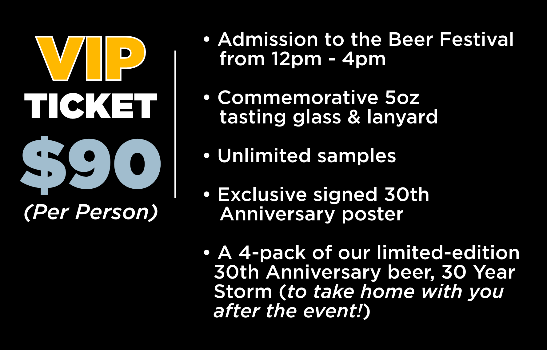 How do tastings work? All VIP and GA ticket holders will receive their 5oz tasting glass at check-in. VIP ticket holders will also receive their lanyard at check-in and their commemorative poster and 4-pack of 30 Year Storm when exiting. Don’t forget to pick up your poster and 4-pack as you leave — it’s a keepsake you won’t want to forget!